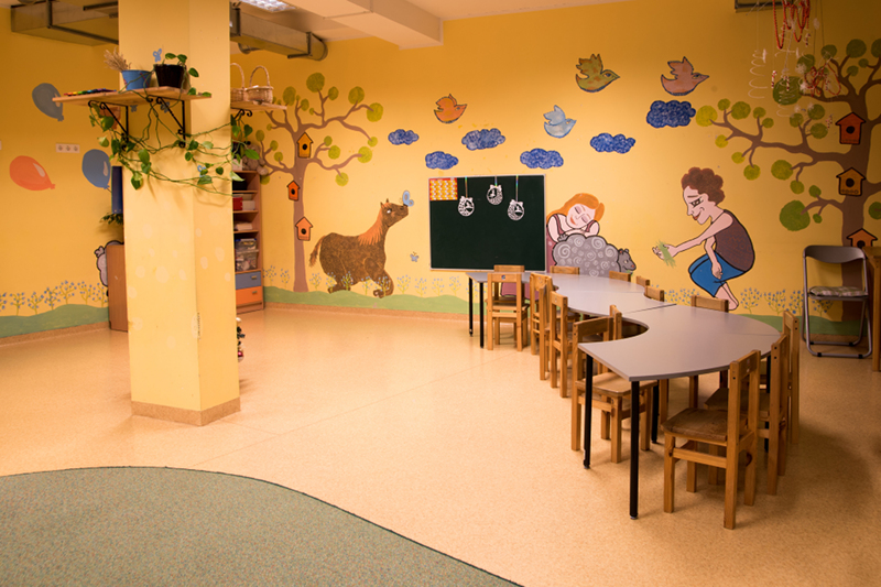 Auklėtoja ir auklėtojos padėjėja prižiūri mažylius erdviose ir šviesiose patalpose.